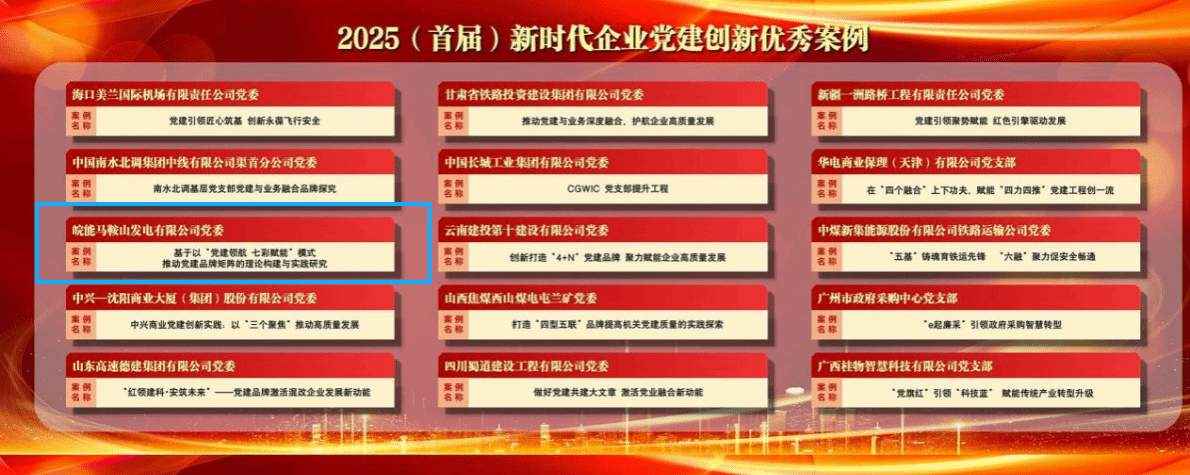 9月20日,由紅旗出版社主辦、紅旗出版社黨史黨建研究院承辦的2025(首屆)新時代企業(yè)黨建經(jīng)驗交流會暨企業(yè)黨建創(chuàng)新優(yōu)秀案例發(fā)布儀式在京舉辦。皖能馬鞍山發(fā)電有限公司黨委選送的《基于以“黨建領航 七彩賦能”模式推動黨建品牌矩陣的理論構建與實踐研究》,在全國1400余個企業(yè)黨建案例競爭中脫穎而出,成功入選2025(首屆)新時代企業(yè)黨建創(chuàng)新優(yōu)秀案例,這份榮譽是對馬鞍山公司黨委黨建工作的高度肯定,也是繼馬鞍山公司黨委“兩先兩創(chuàng)”品牌榮獲2024年度全國企業(yè)黨建創(chuàng)新優(yōu)秀案例之后,再獲殊榮!