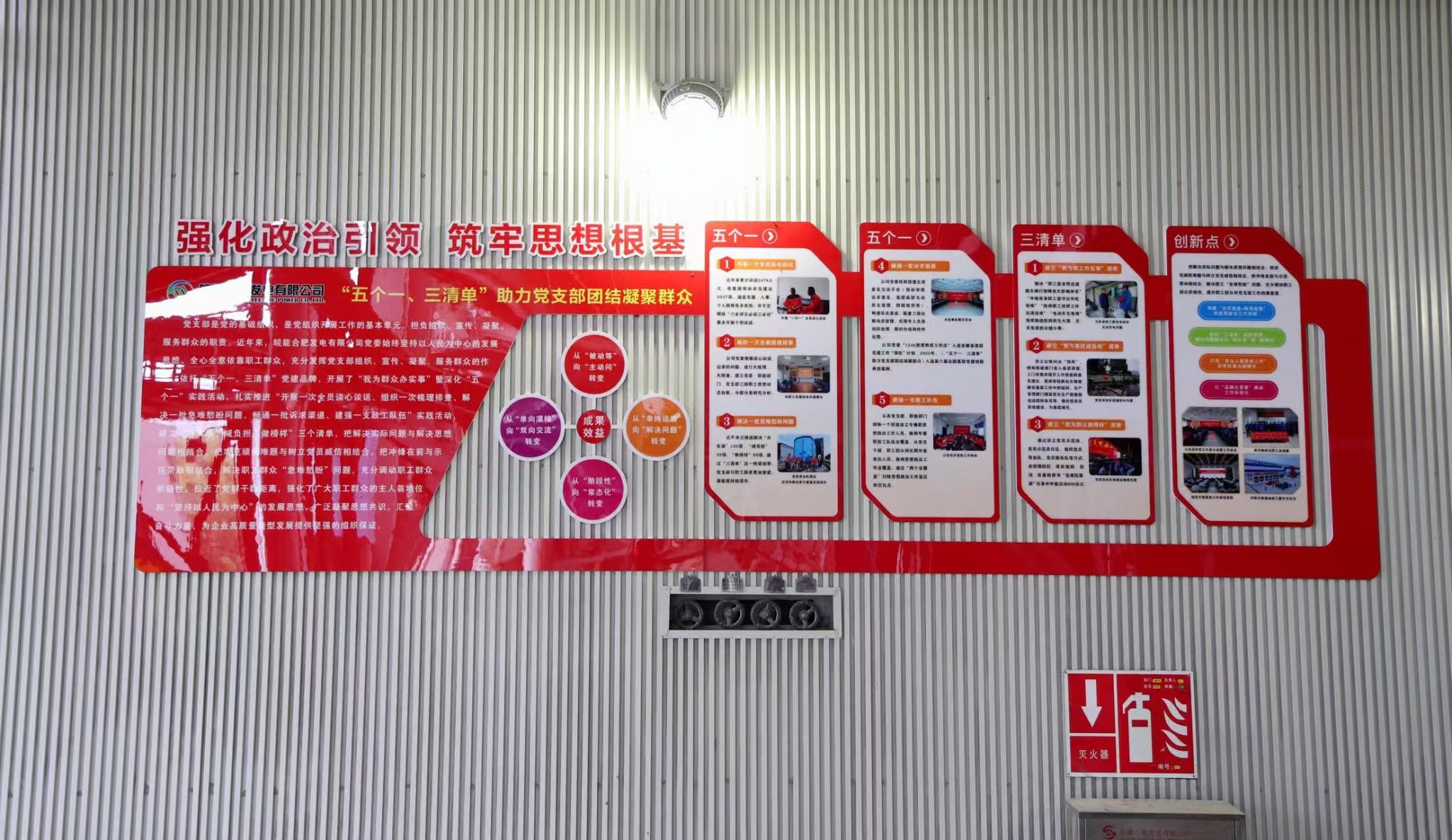 近日,皖能合肥公司6號爐零米層內(nèi)煥新添彩,一面主題鮮明、內(nèi)容豐富的黨建文化墻正式亮相。這面依托隔音墻板打造的文化宣傳陣地,將黨的建設(shè)與生產(chǎn)場景深度融合,成為傳播公司黨委及黨支部黨建品牌理念,凝聚職工奮進力量的“新窗口”。