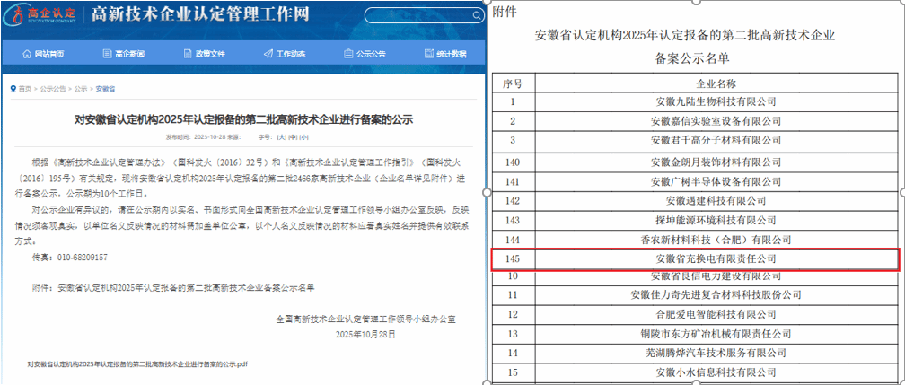 近日,全國高新技術(shù)企業(yè)認定管理工作領(lǐng)導(dǎo)小組辦公室對安徽省認定機構(gòu)2025年認定報備的第二批高新技術(shù)企業(yè)進行備案公示,省充換電公司順利通過認定,成功躋身國家級高新技術(shù)企業(yè)行列。