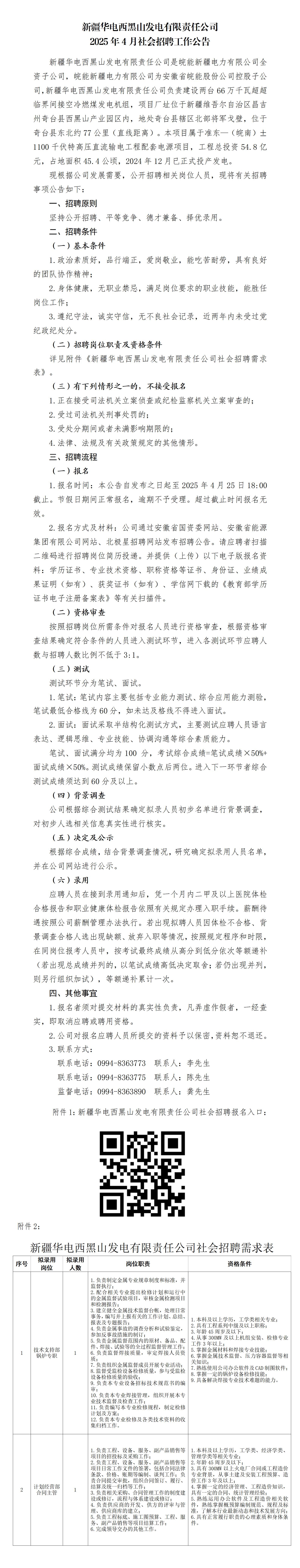 新疆華電西黑山發(fā)電有限責(zé)任公司2025年4月社會招聘工作公告