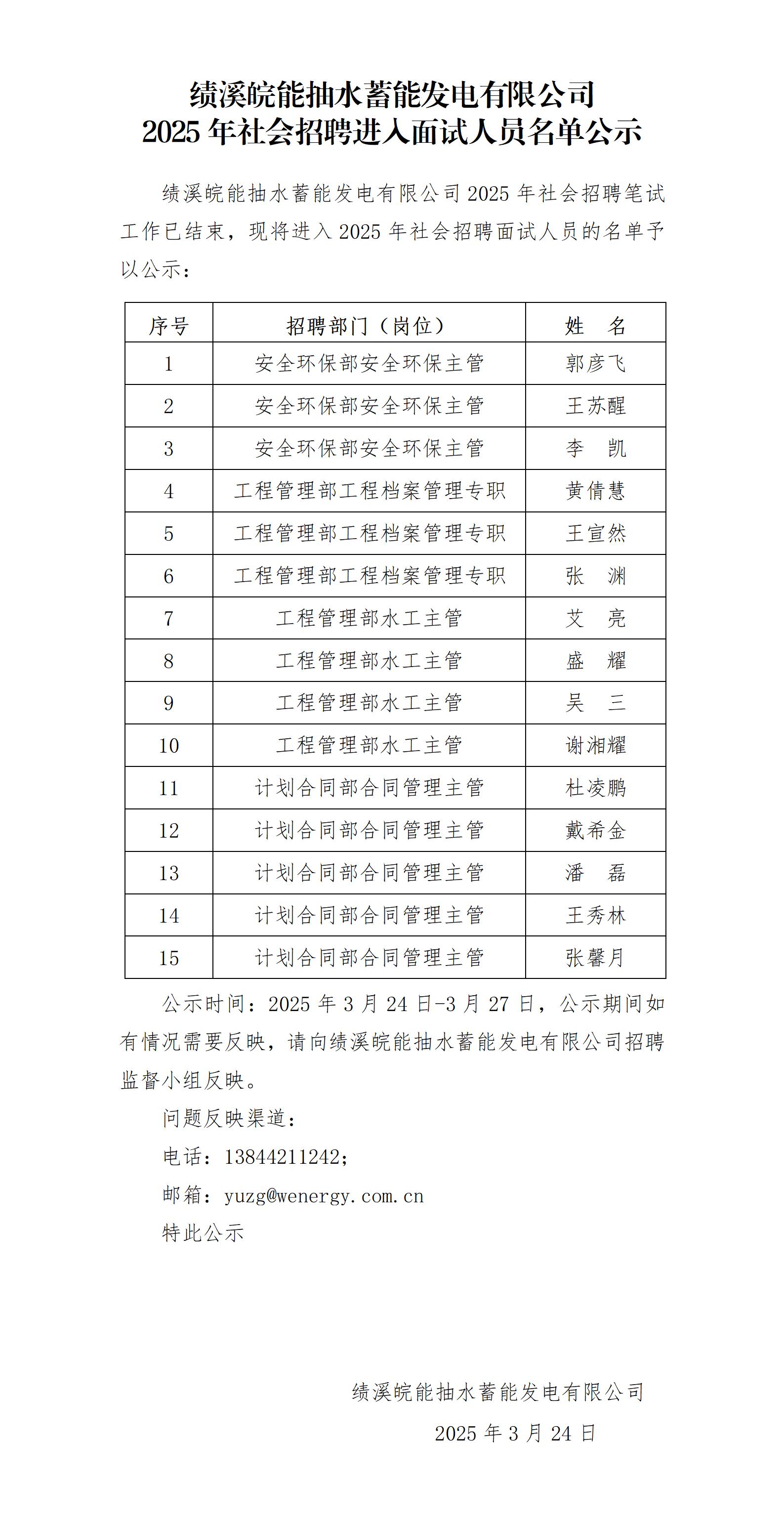 績溪皖能抽水蓄能發(fā)電有限公司2025年社會招聘進(jìn)入面試人員名單公示