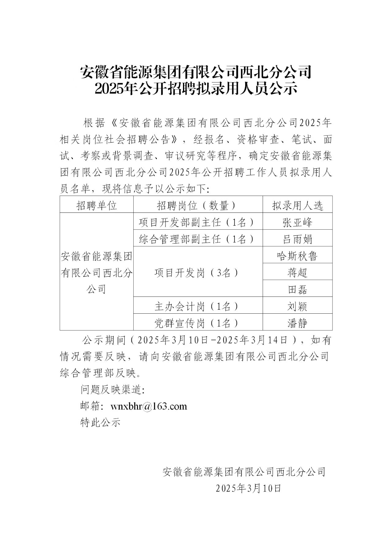 安徽省能源集團有限公司西北分公司2025年公開招聘擬錄用人員公示