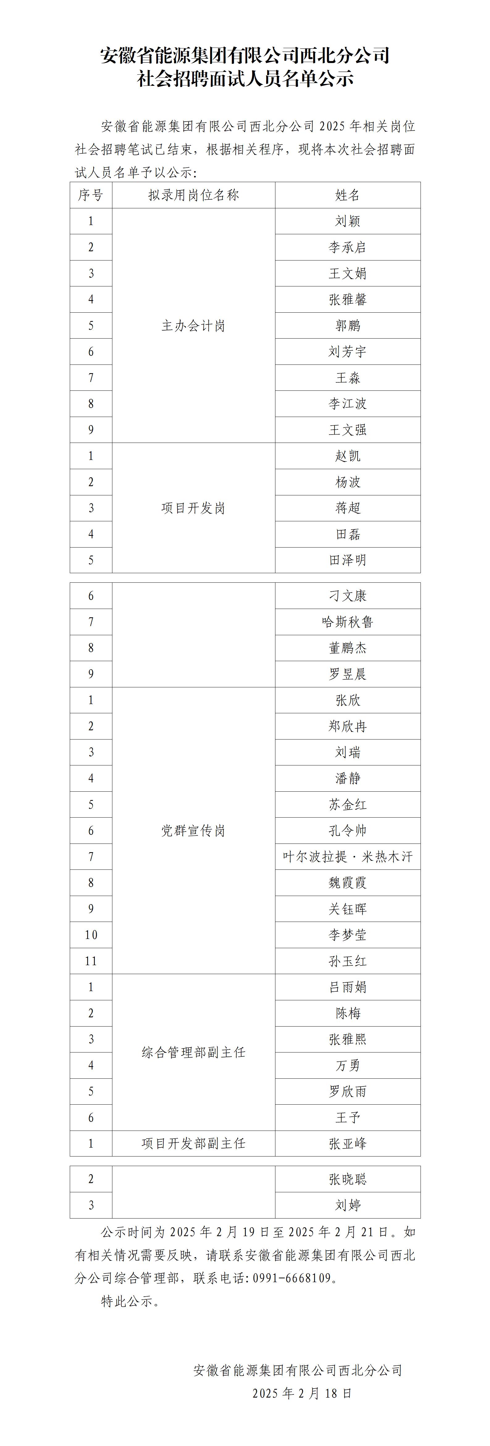 安徽省能源集團有限公司西北分公司社會招聘面試人員名單公示