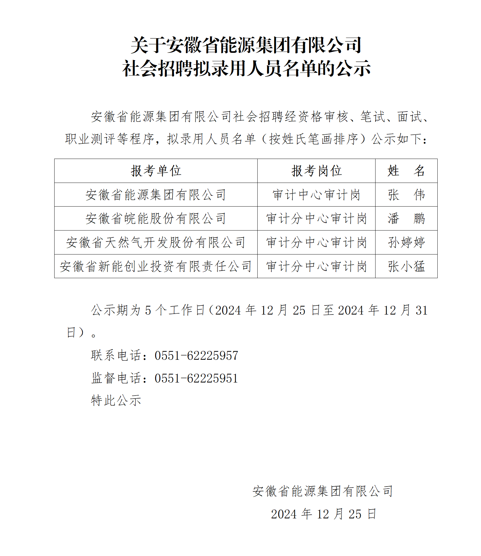 關(guān)于安徽省能源集團有限公司社會招聘擬錄用人員名單的公示