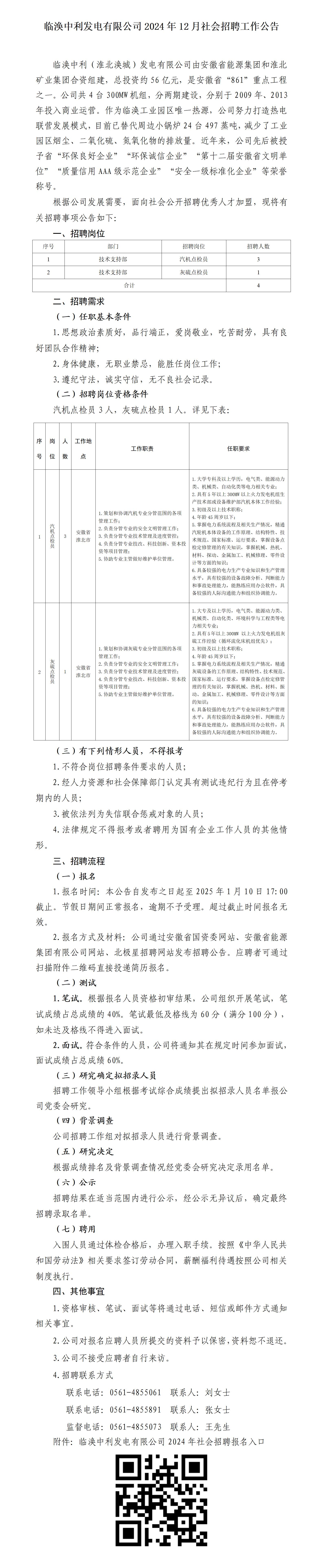 臨渙中利發(fā)電有限公司2024年12月社會招聘工作公告
