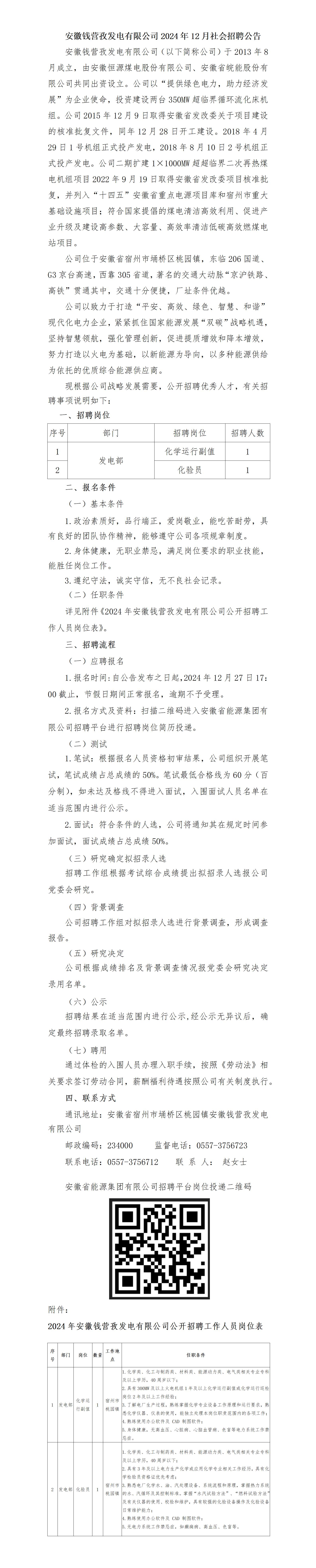 安徽錢營孜發(fā)電有限公司2024年12月社會招聘公告