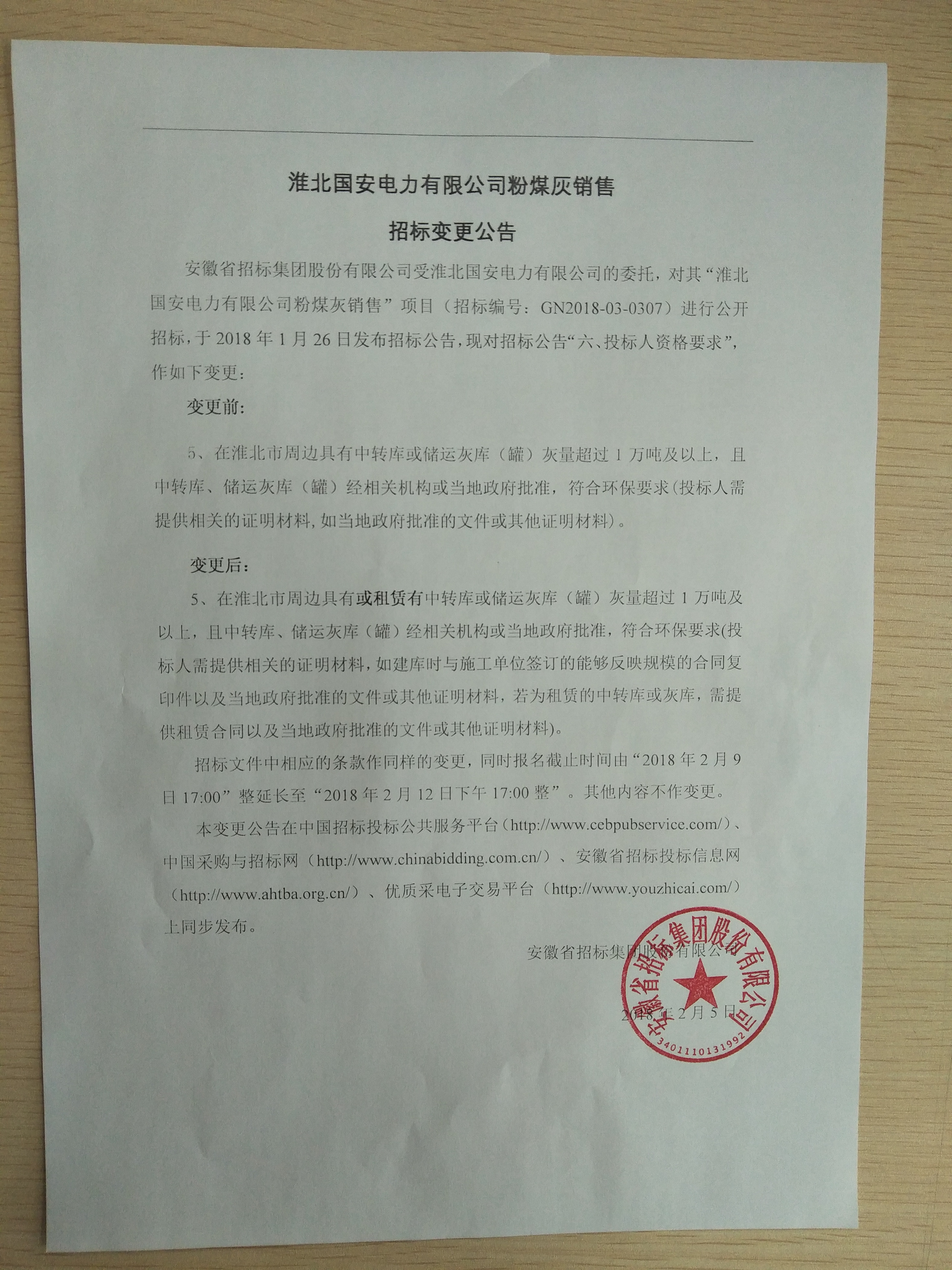 淮北國安公司粉煤灰招標(biāo)變更公告