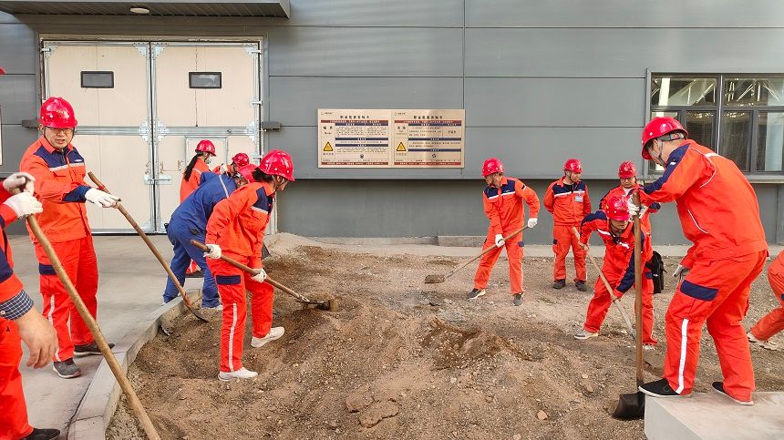 活動(dòng)中,該公司領(lǐng)導(dǎo)班子率先垂范,按區(qū)域劃分責(zé)任片區(qū),手持鐵鍬踏入坑洼區(qū)域帶頭作業(yè)。全體黨員迅速響應(yīng),一場(chǎng)熱火朝天的環(huán)境整治攻堅(jiān)戰(zhàn)就此打響。運(yùn)土、勻土、平整、夯實(shí),各個(gè)環(huán)節(jié)銜接有序;遇到距離較遠(yuǎn)的作業(yè)點(diǎn),大家或推起小車穿梭往返,或以一鍬接一鍬的方式接力運(yùn)送,汗水浸透了衣衫,卻絲毫沒有減慢勞作的節(jié)奏?!包h旗指到哪里,黨員的鐵鍬就鏟到哪里”,紅色的黨旗在作業(yè)現(xiàn)場(chǎng)高高飄揚(yáng),成為廠區(qū)里最亮眼的風(fēng)景線。