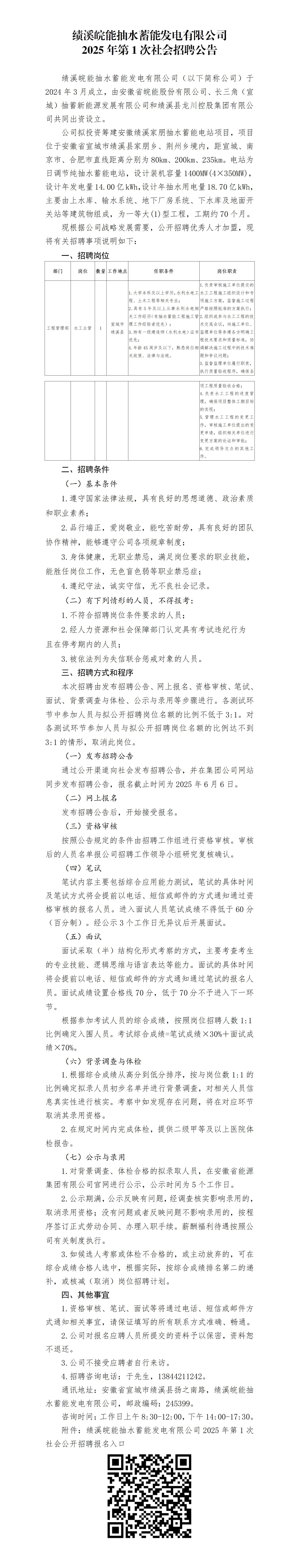 績溪皖能抽水蓄能發(fā)電有限公司2025年第1次社會招聘公告