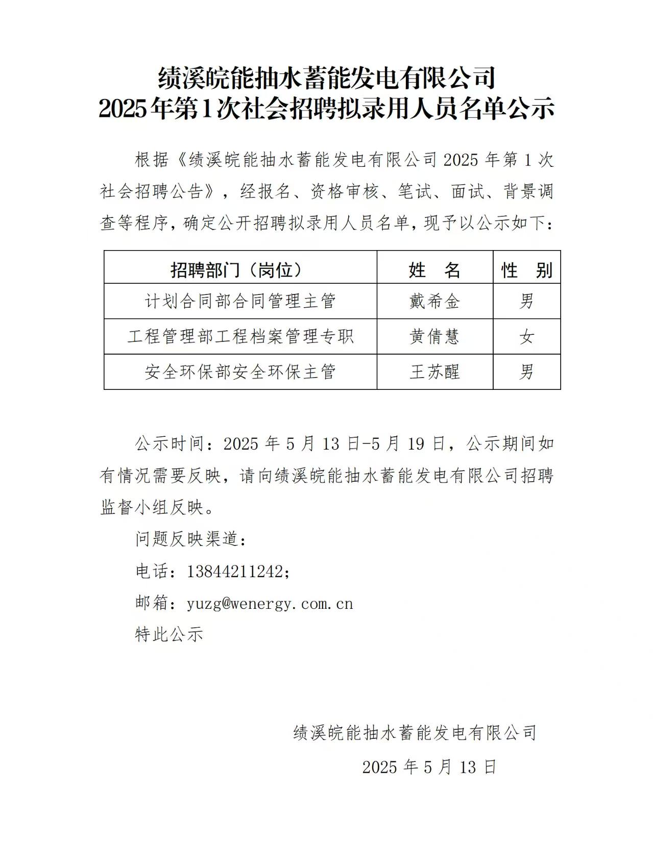 績溪皖能抽水蓄能發(fā)電有限公司2025年第1次社會招聘擬錄用名單公示