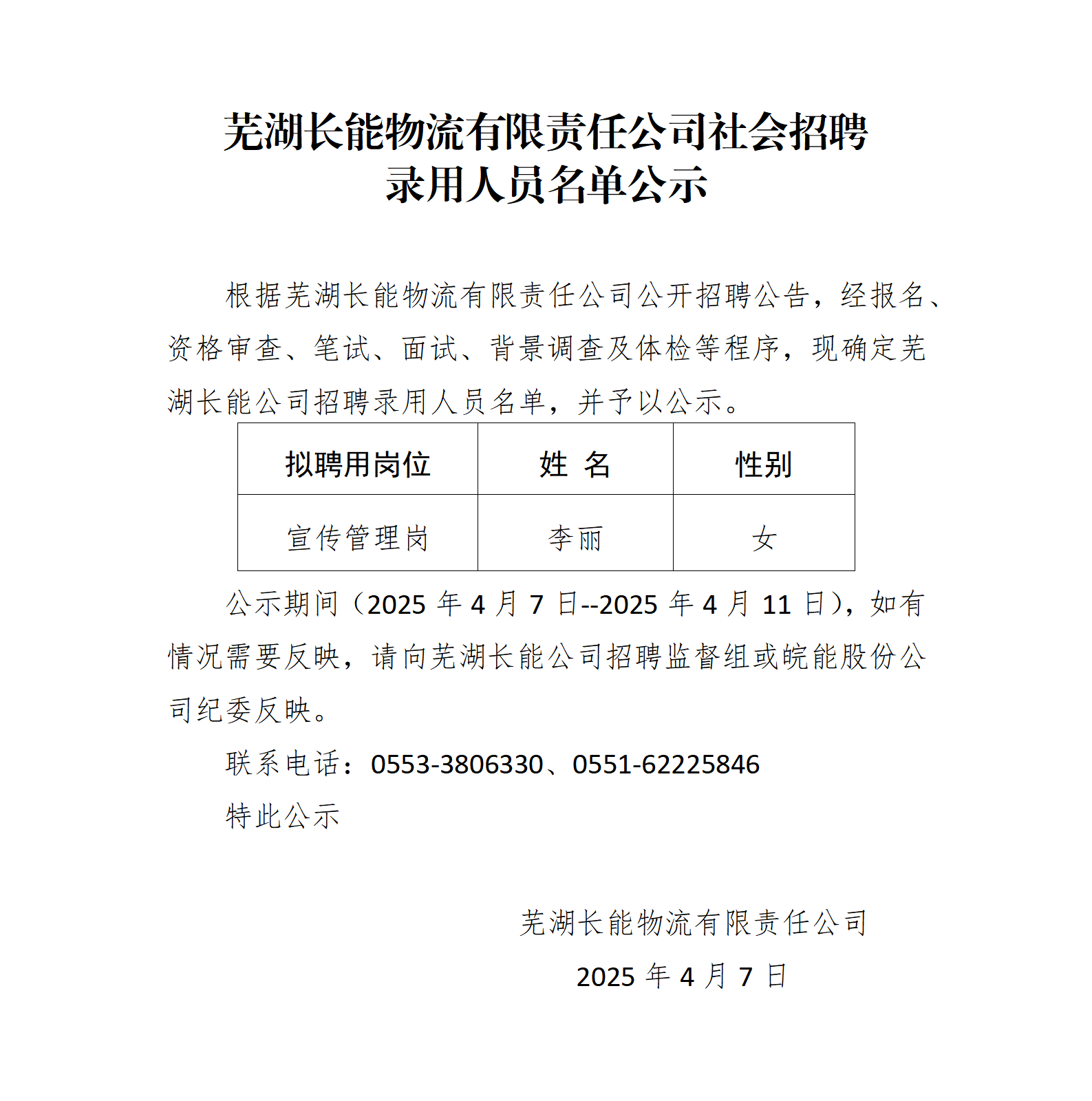 蕪湖長(zhǎng)能物流有限責(zé)任公司社會(huì)招聘錄用人員名單公示