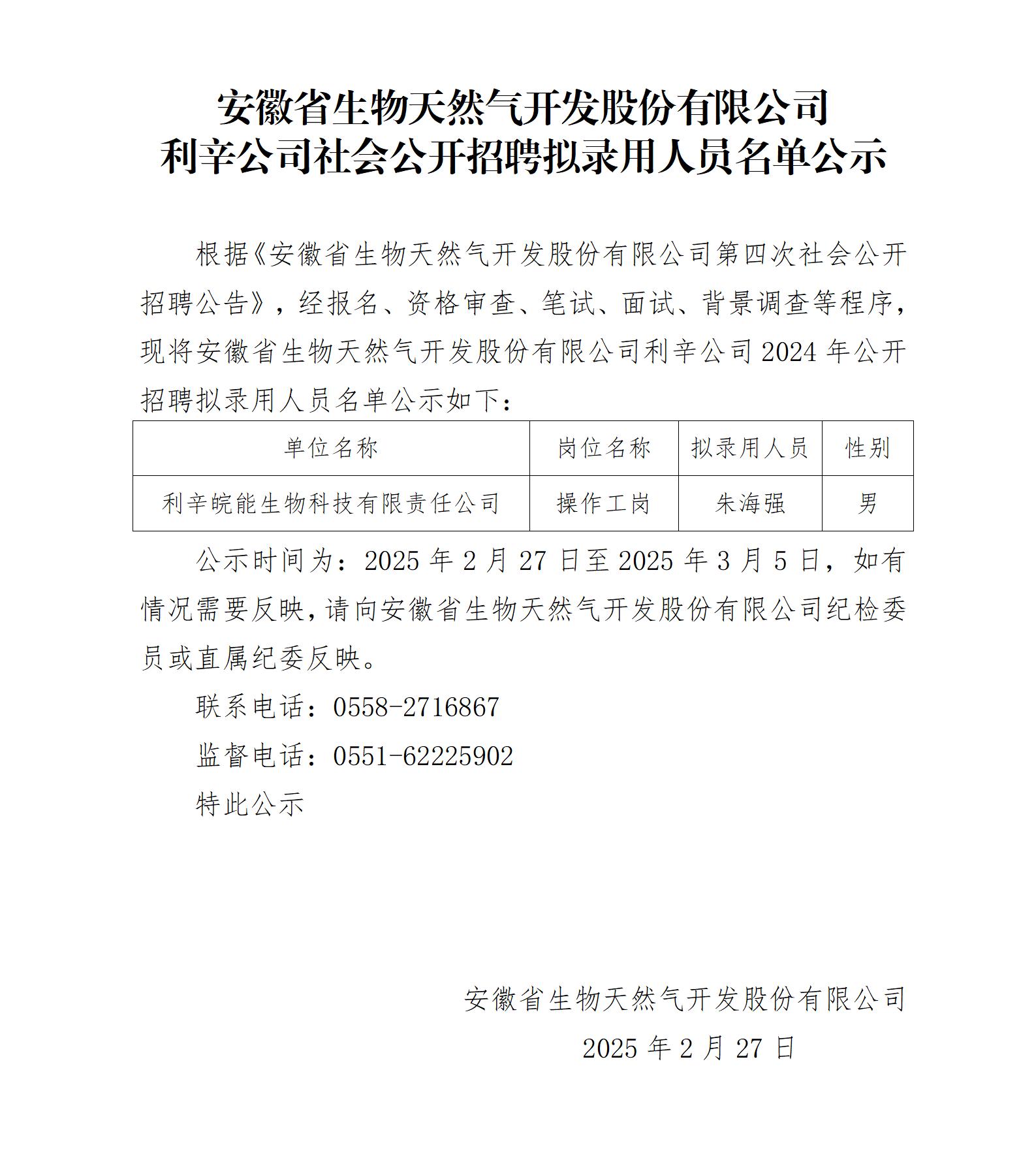 安徽省生物天然氣開發(fā)股份有限公司利辛公司社會公開招聘擬錄用人員名單公示