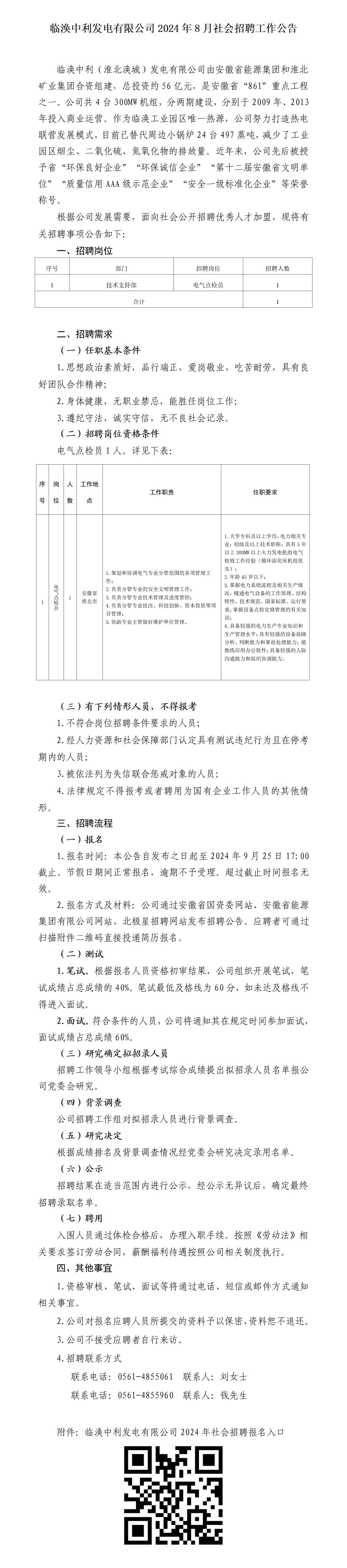 臨渙中利發(fā)電有限公司2024年8月社會(huì)招聘工作公告
