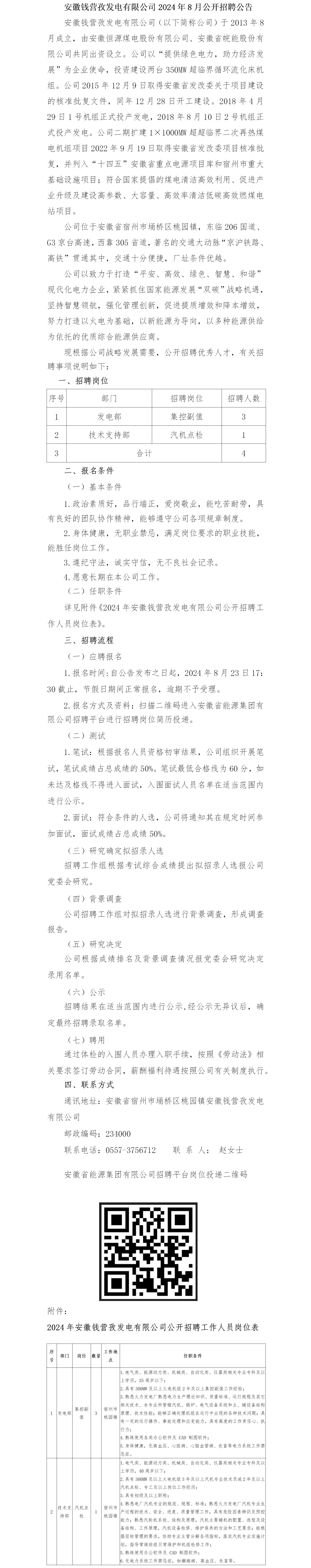 安徽錢營孜發(fā)電有限公司2024年8月公開招聘公告