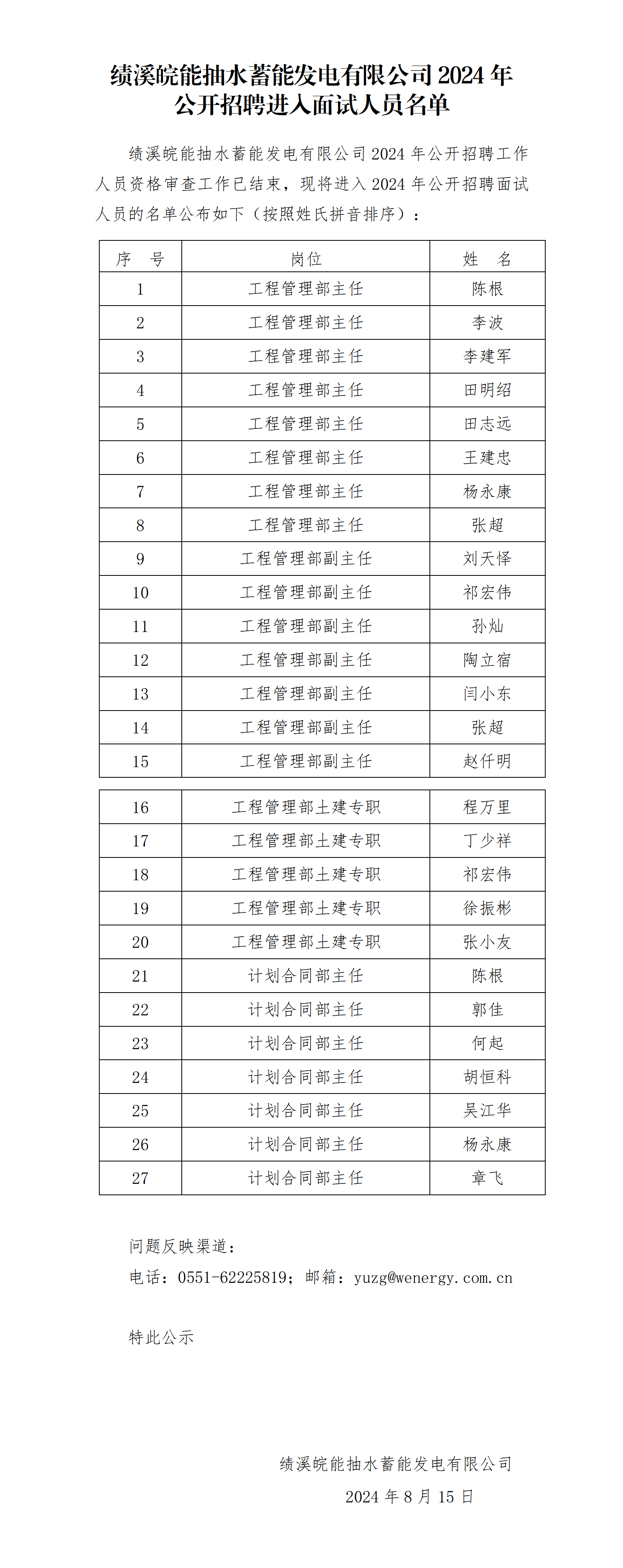 績(jī)溪皖能抽水蓄能發(fā)電有限公司2024年公開招聘進(jìn)入面試人員名單
