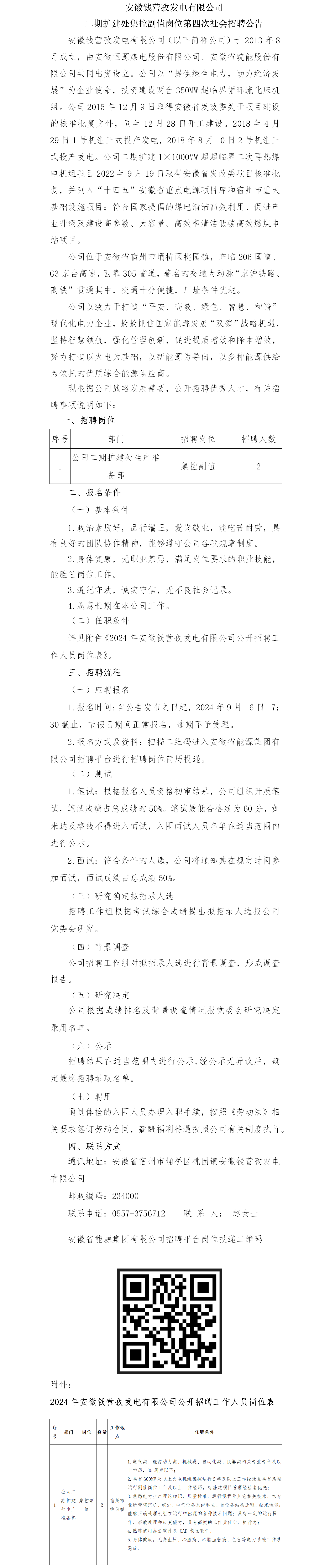 安徽錢(qián)營(yíng)孜發(fā)電有限公司二期擴(kuò)建處集控副值崗位第四次社會(huì)招聘公告