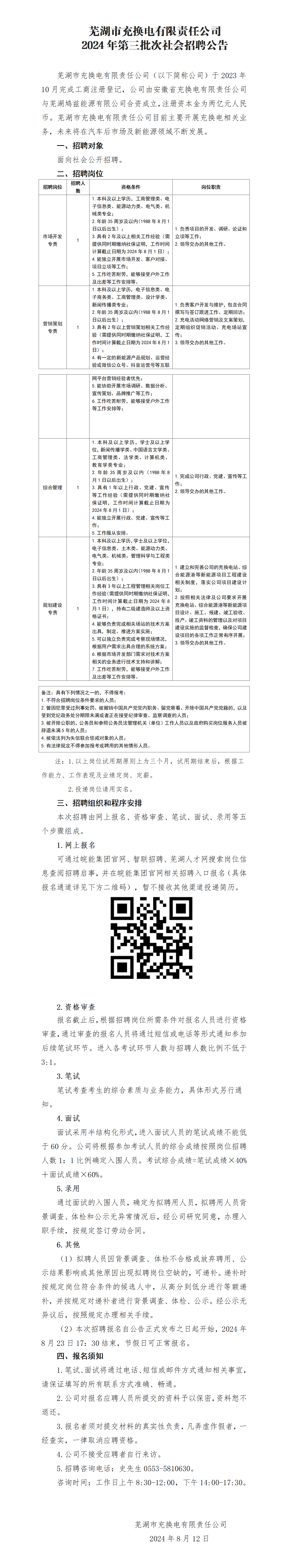 蕪湖市充換電有限責任公司2024年第三批次社會招聘公告