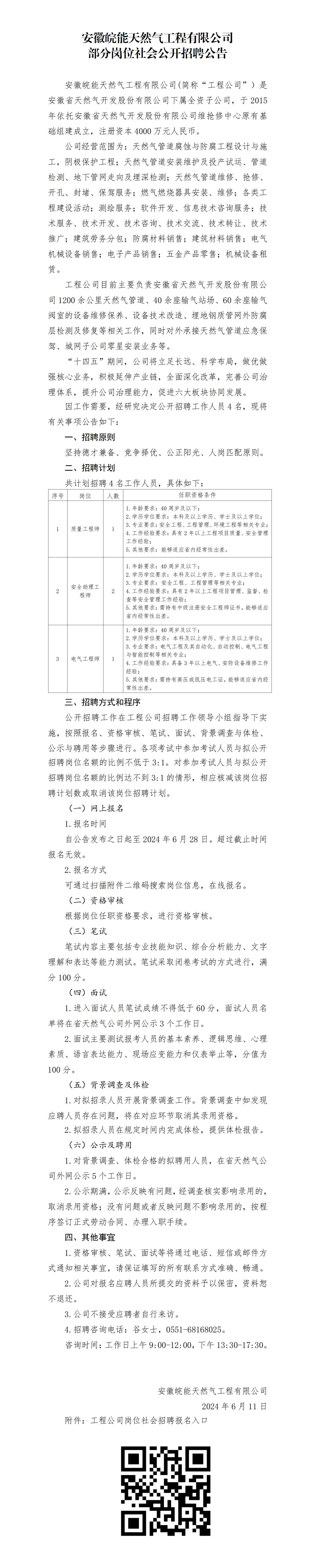 安徽皖能天然氣工程有限公司部分崗位社會公開招聘公告