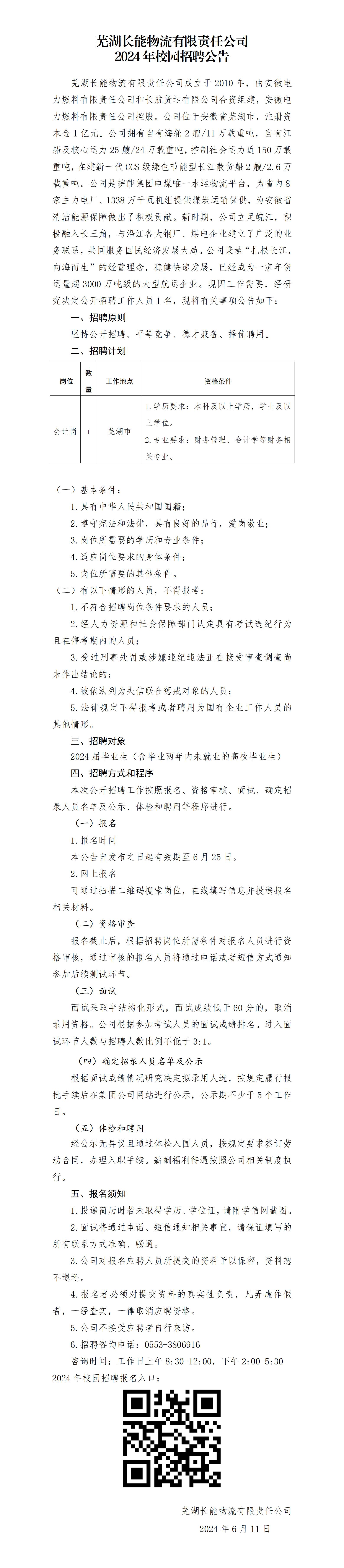 蕪湖長能物流有限責任公司2024年校園招聘公告