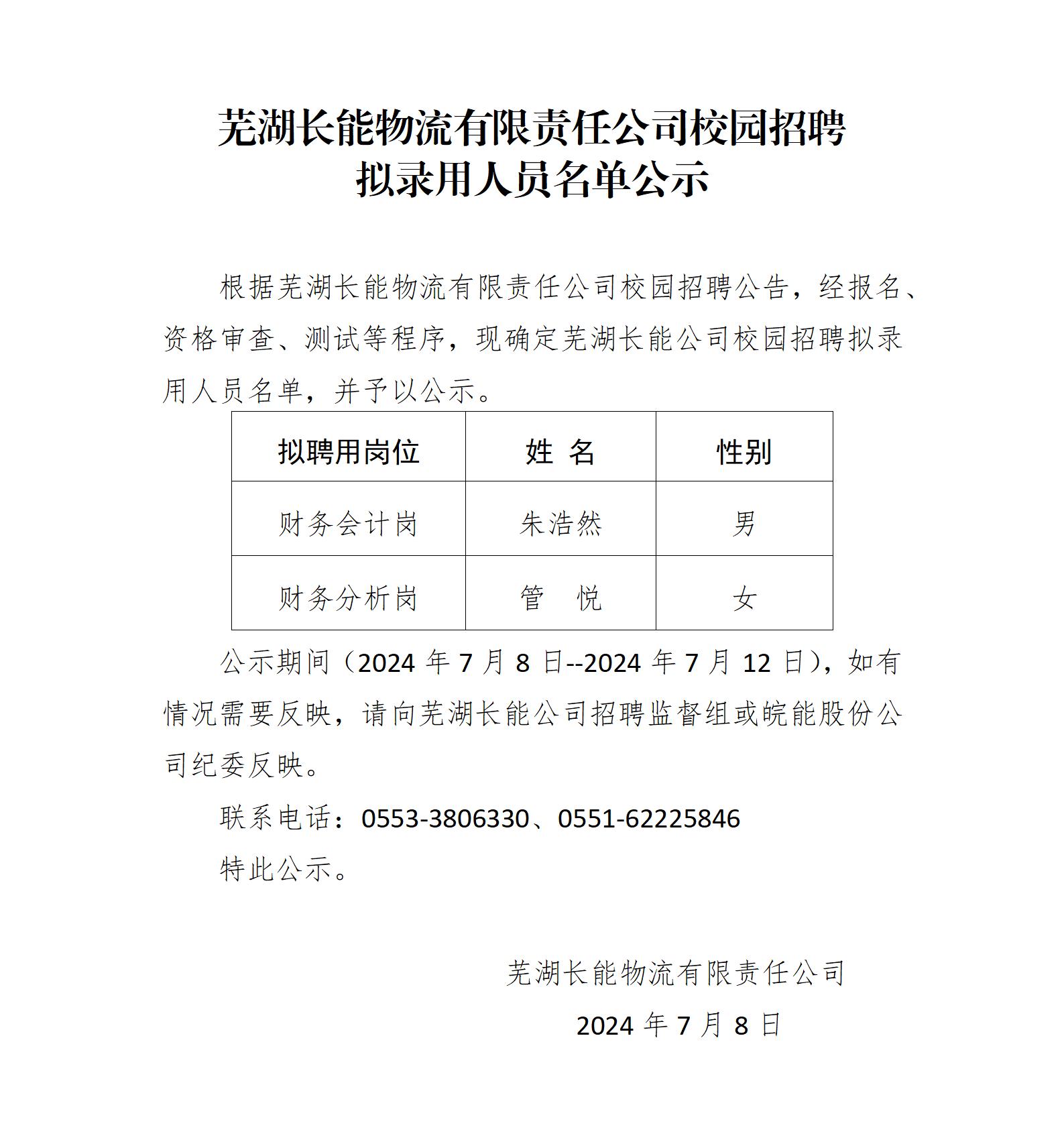 蕪湖長(zhǎng)能物流有限責(zé)任公司校園招聘擬錄用人員名單公示