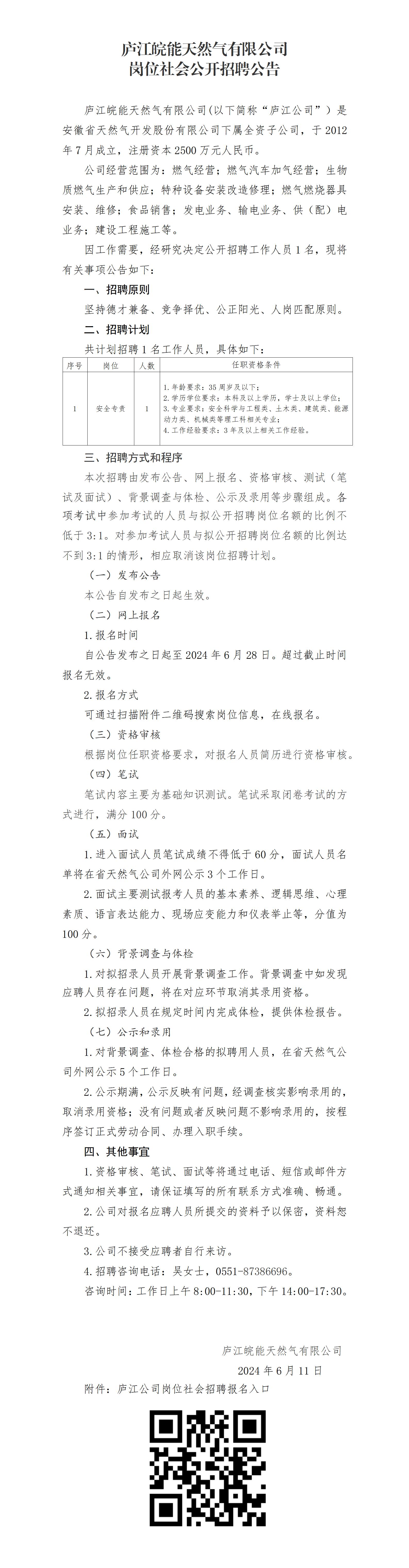 廬江皖能天然氣有限公司崗位社會公開招聘公告