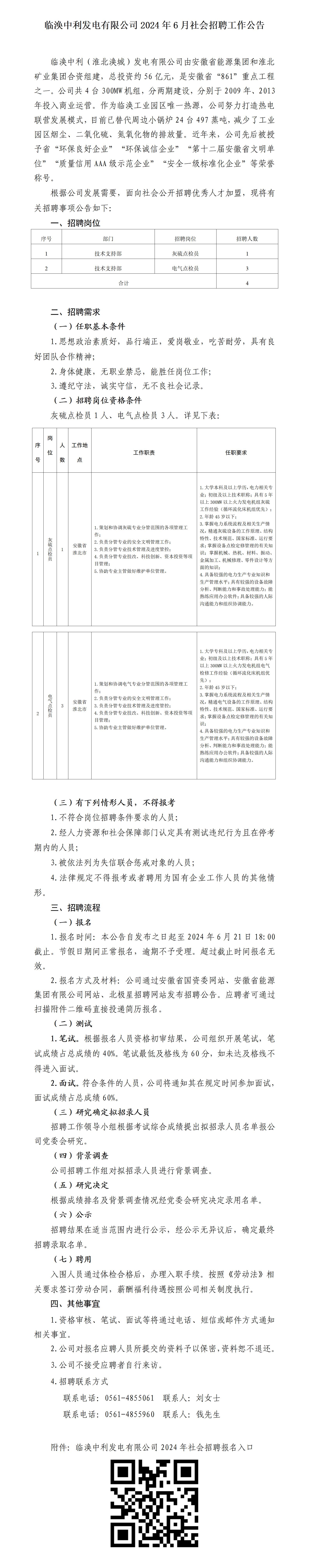 臨渙中利發(fā)電有限公司2024年6月社會招聘工作公告