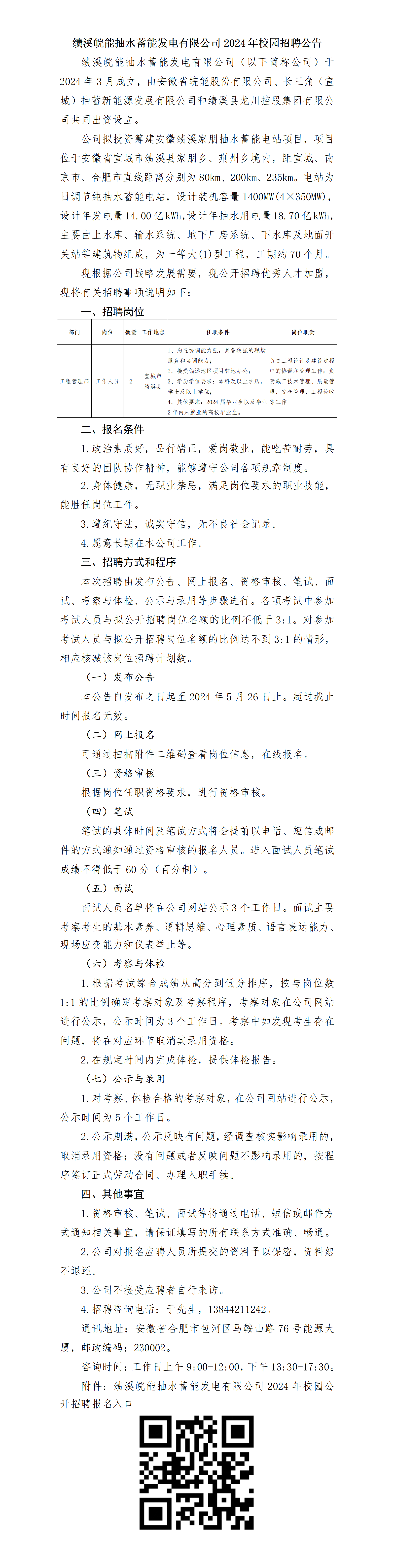 績溪皖能抽水蓄能發(fā)電有限公司2024年校園招聘公告