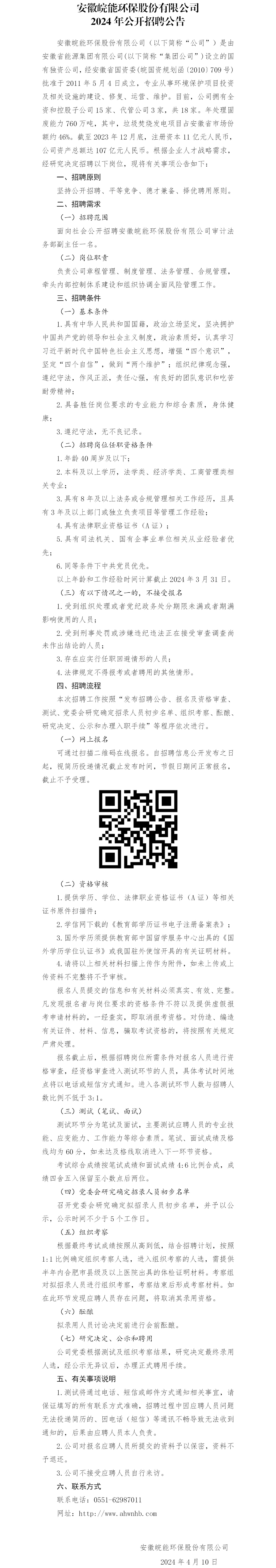 安徽皖能環(huán)保股份有限公司2024年公開招聘公告