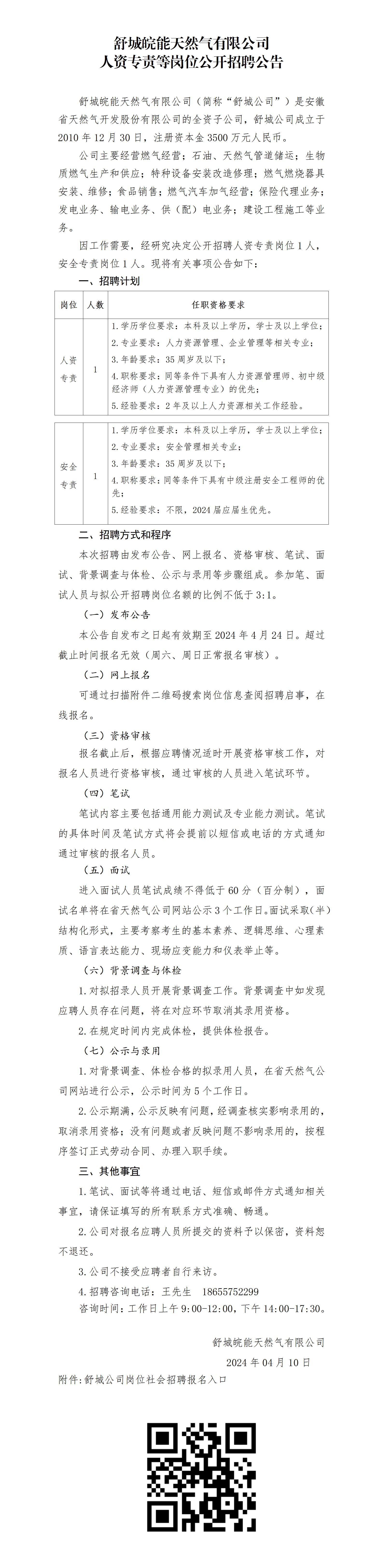 舒城皖能天然氣有限公司人資專責(zé)等崗位公開招聘公告