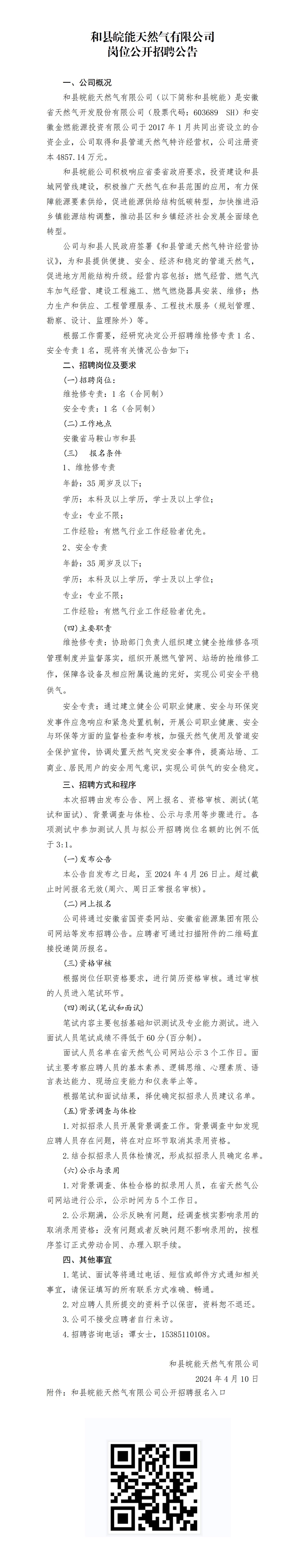 和縣皖能天然氣有限公司崗位公開招聘公告