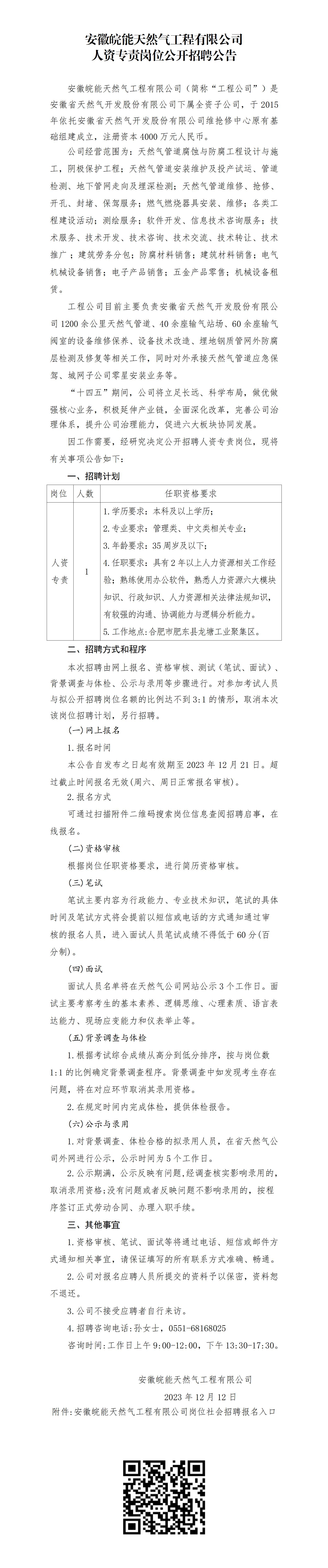 安徽皖能天然氣工程有限公司人資專責崗位公開招聘公告