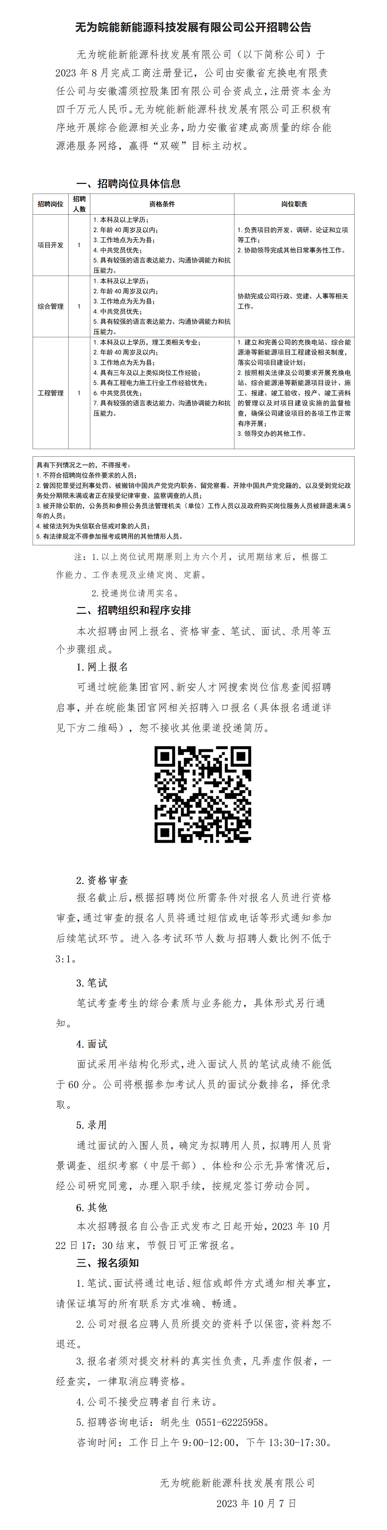 無為皖能新能源科技發(fā)展有限公司公開招聘公告