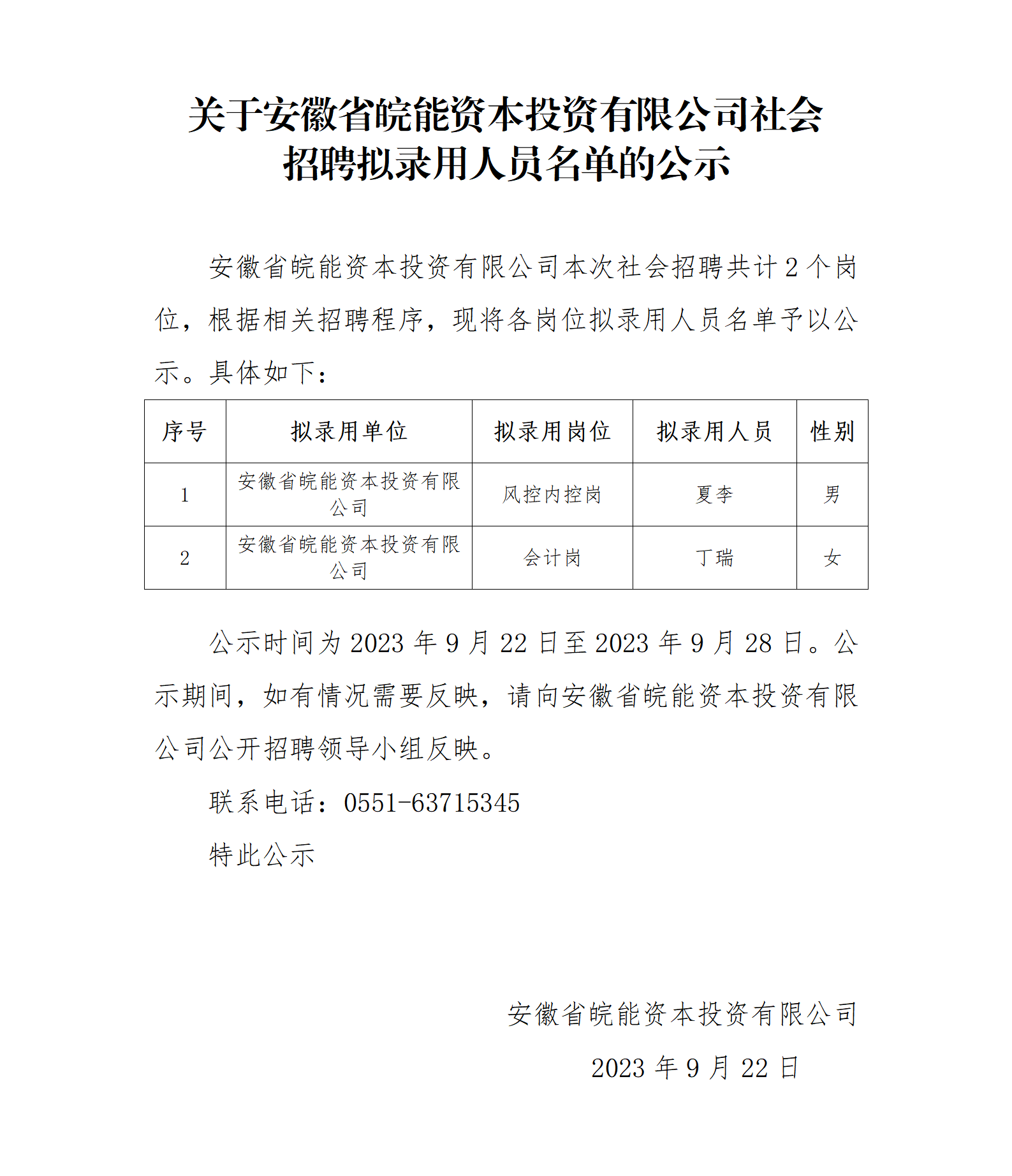 關于安徽省皖能資本投資有限公司社會招聘擬錄用人員名單的公示