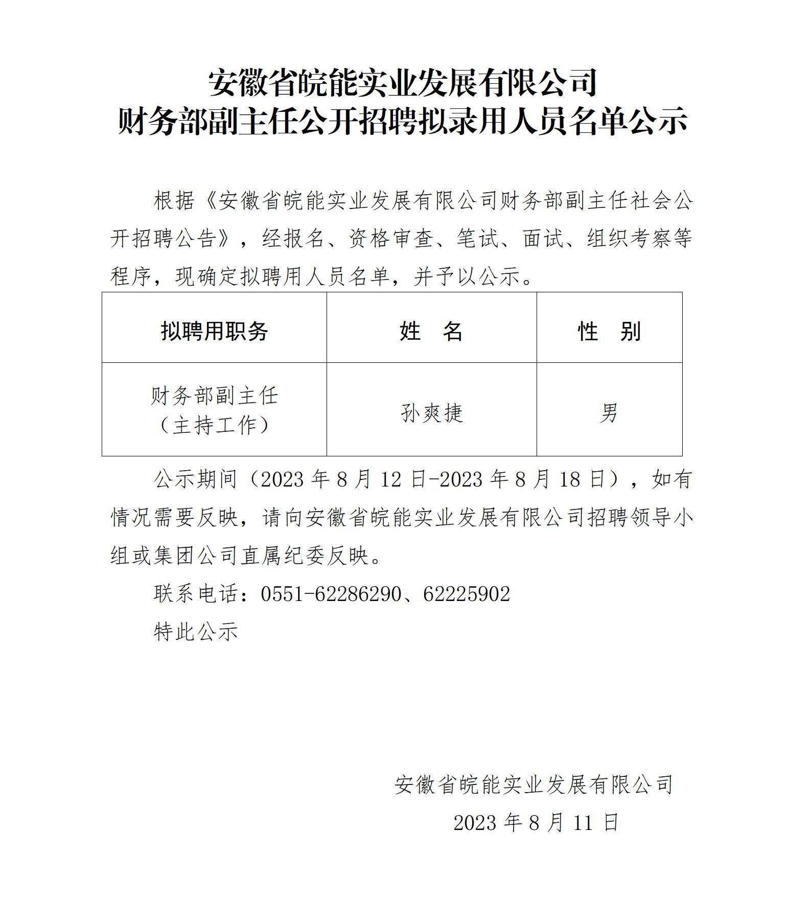 安徽皖能實(shí)業(yè)發(fā)展有限公司財(cái)務(wù)部副主任公開招聘擬錄用人員名單公示