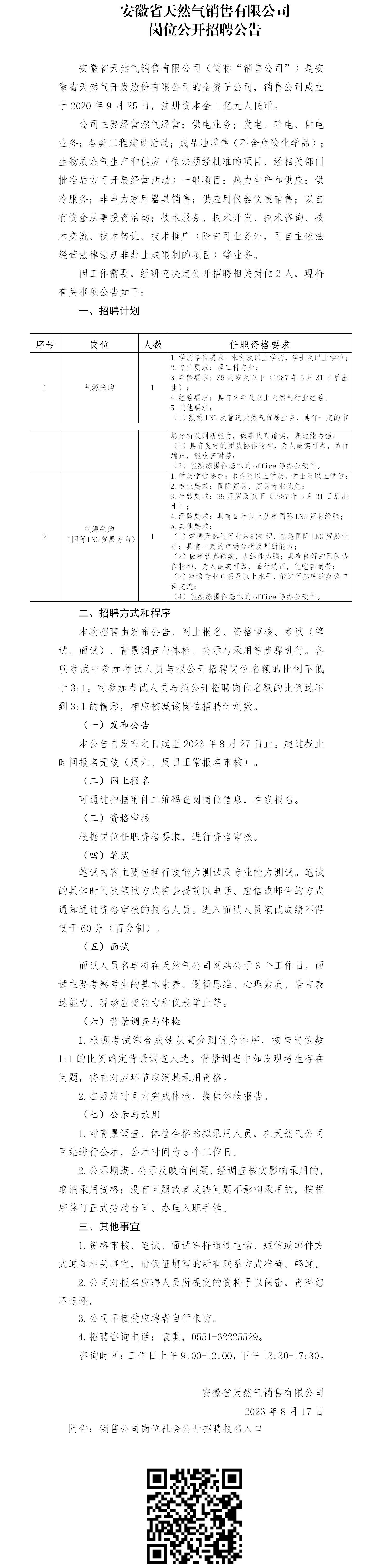 安徽省天然氣銷售有限公司崗位公開招聘公告