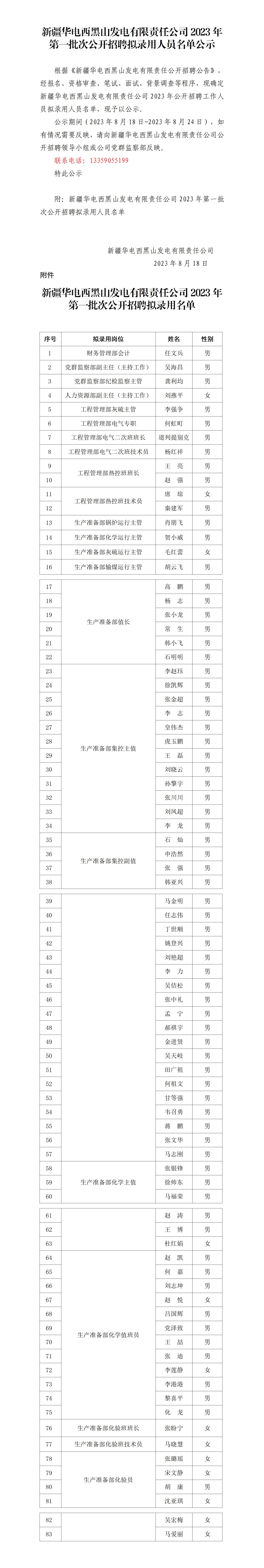 新疆華電西黑山發(fā)電有限責(zé)任公司2023年第一批次公開(kāi)招聘擬錄用人員名單公示