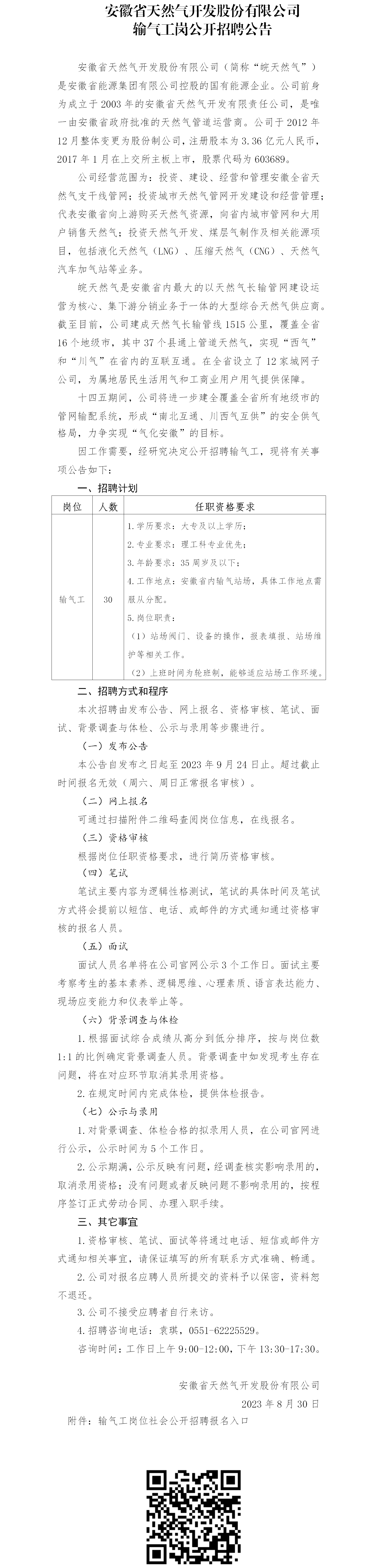 安徽省天然氣開發(fā)股份有限公司輸氣工崗公開招聘公告