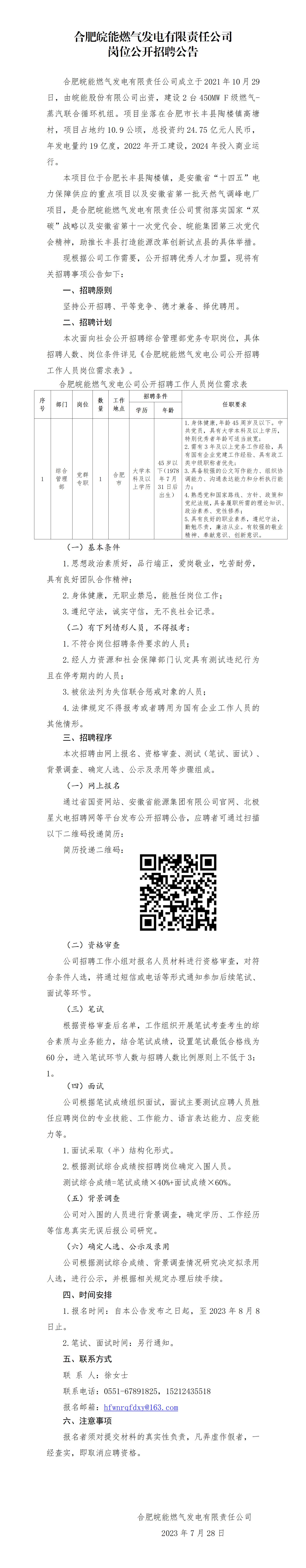 合肥皖能燃氣發(fā)電有限責任公司崗位公開招聘公告