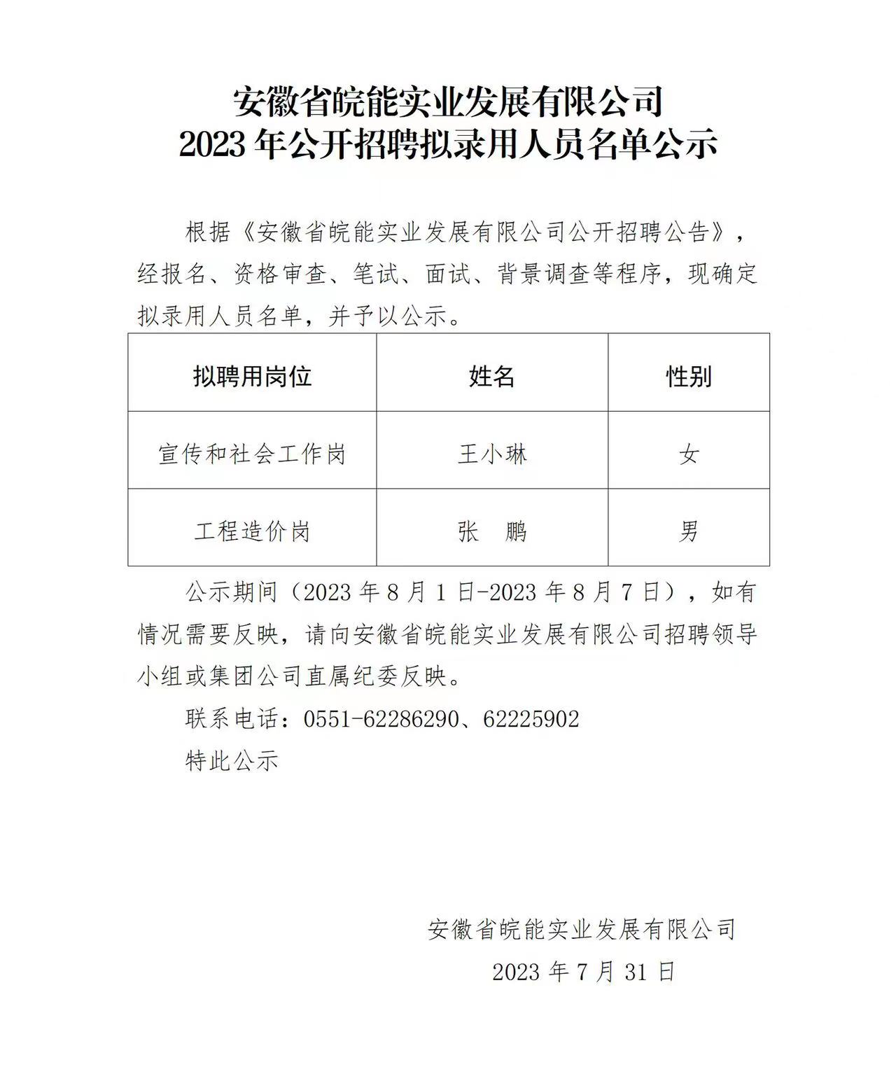 安徽省皖能實業(yè)發(fā)展有限公司2023年公開招聘擬錄用人員名單公示
