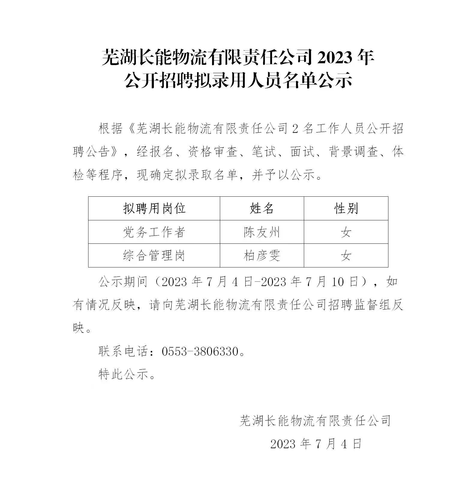 蕪湖長能物流有限責(zé)任公司2023年公開招聘擬錄用人員名單公示