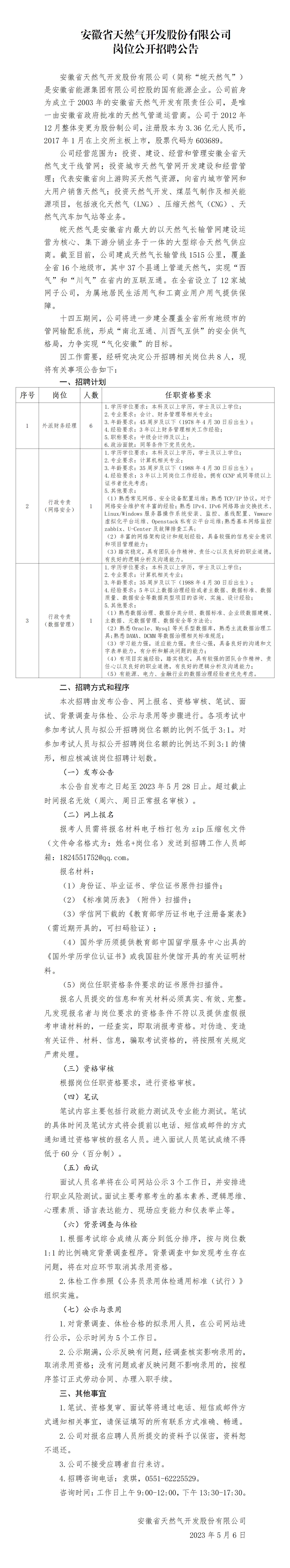 安徽省天然氣開(kāi)發(fā)股份有限公司崗位公開(kāi)招聘公告