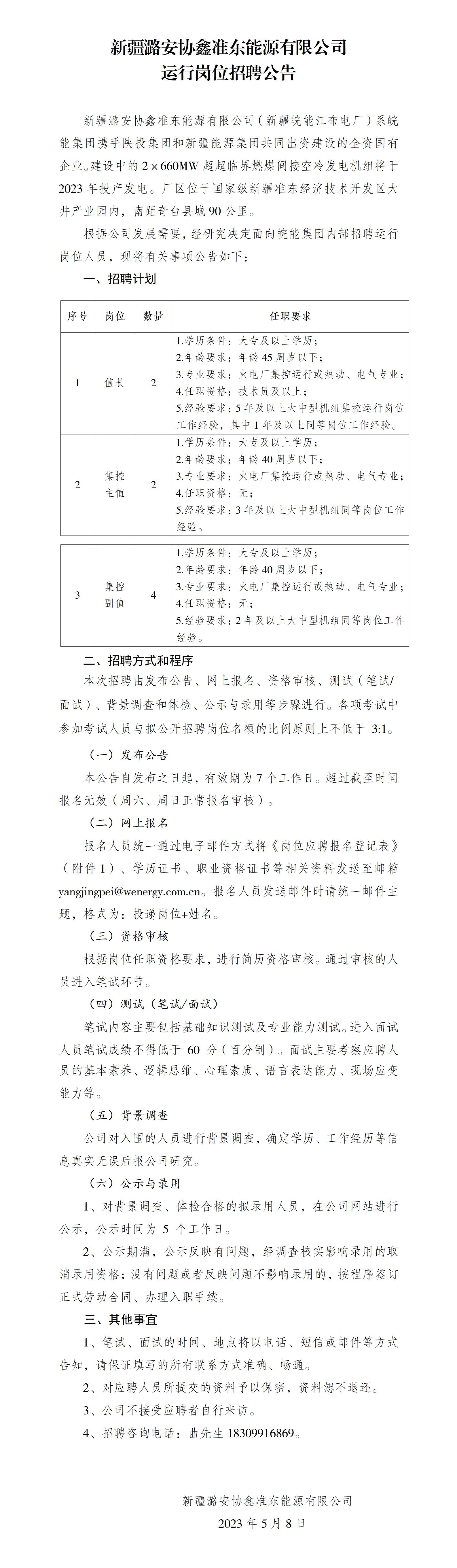 新疆潞安協(xié)鑫準(zhǔn)東能源有限公司運(yùn)行崗位招聘公告