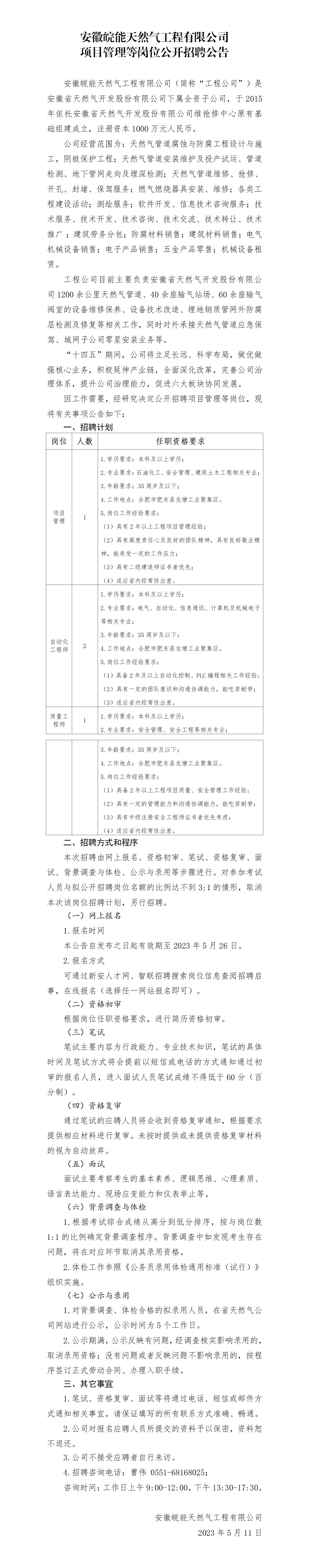 安徽皖能天然氣工程有限公司項(xiàng)目管理等崗位公開(kāi)招聘公告