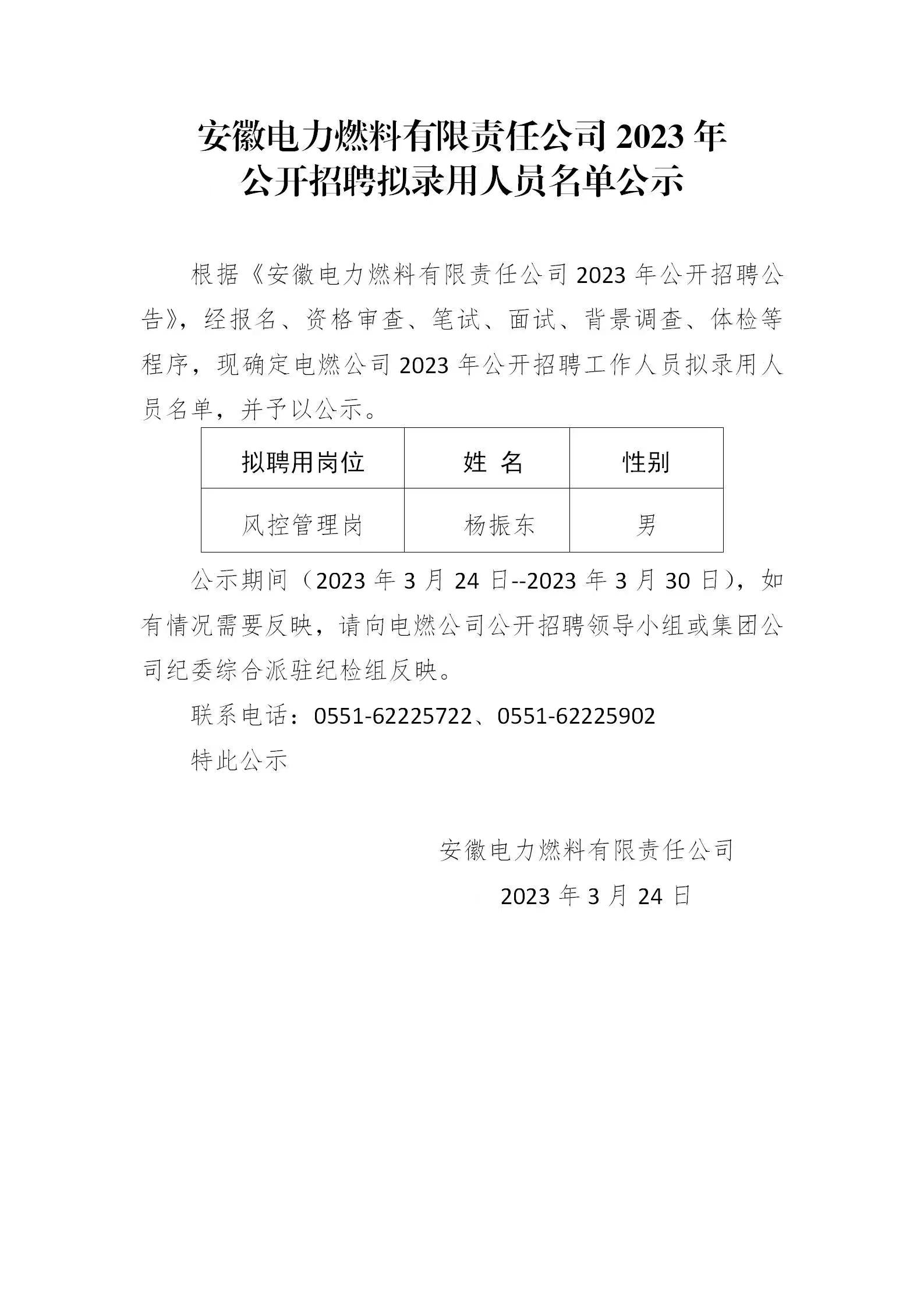 安徽電力燃料有限責(zé)任公司2023 年公開招聘擬錄用人員名單公示