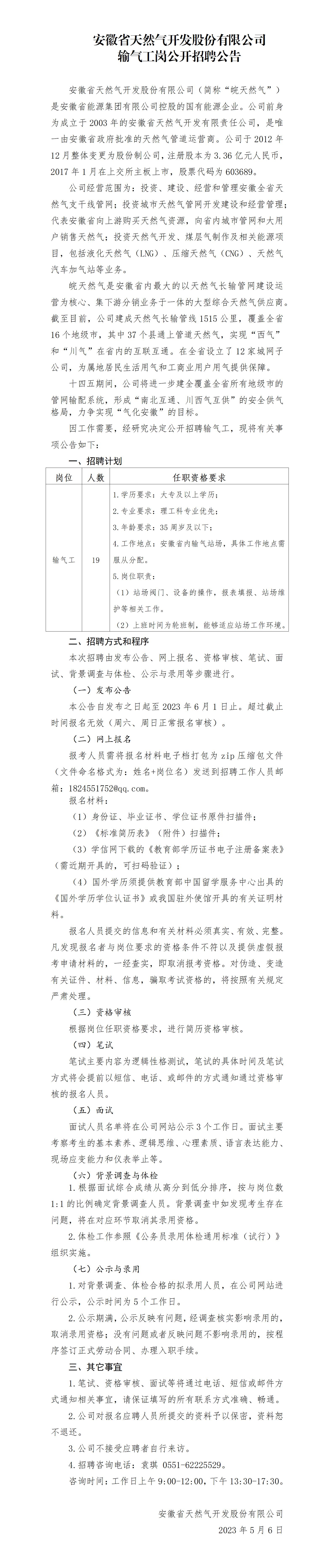 安徽省天然氣開發(fā)股份有限公司輸氣工崗公開招聘公告