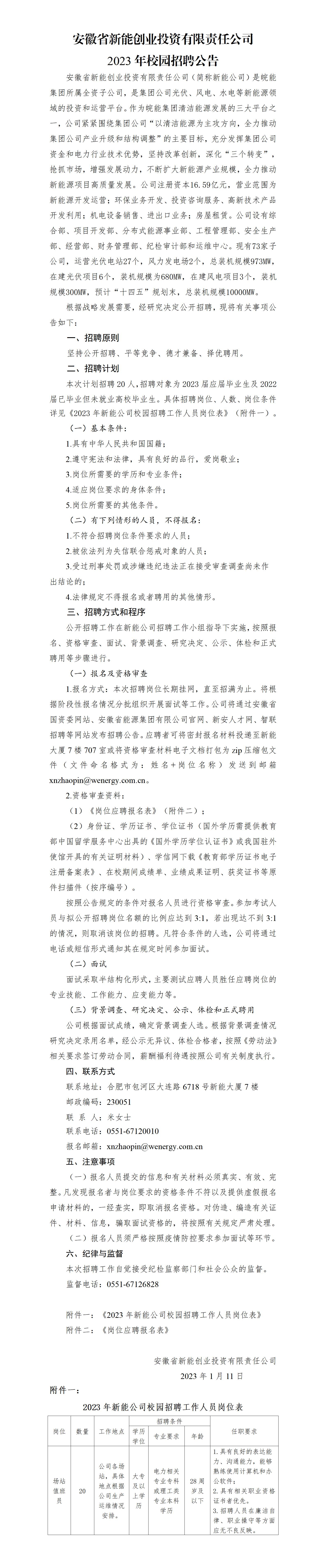 安徽省新能創(chuàng)業(yè)投資有限責(zé)任公司2023年校園招聘公告