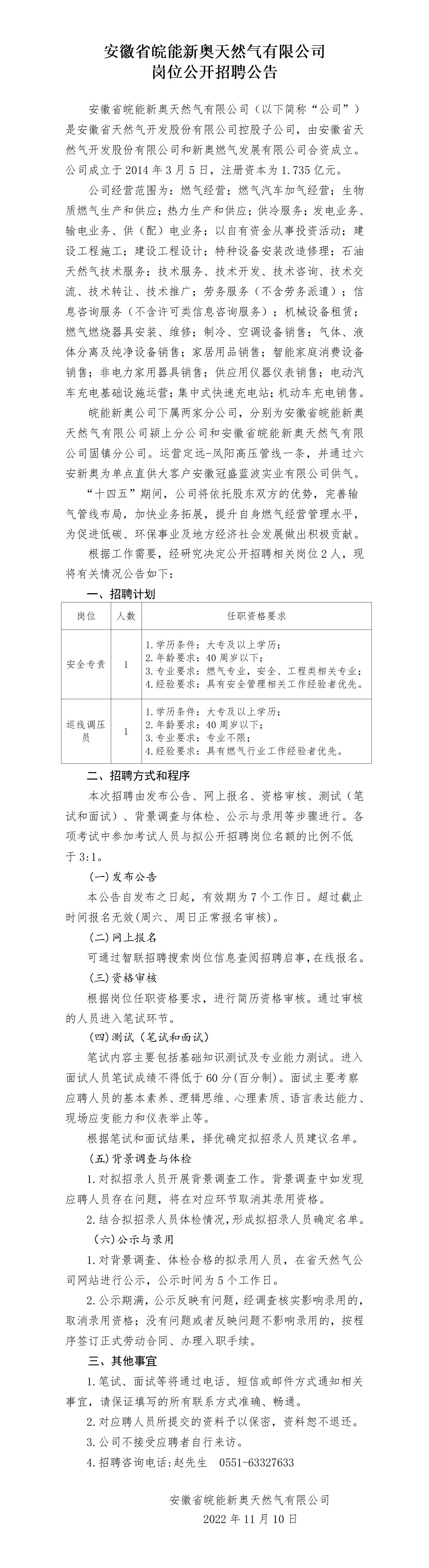 安徽省皖能新奧天然氣有限公司崗位公開招聘公告