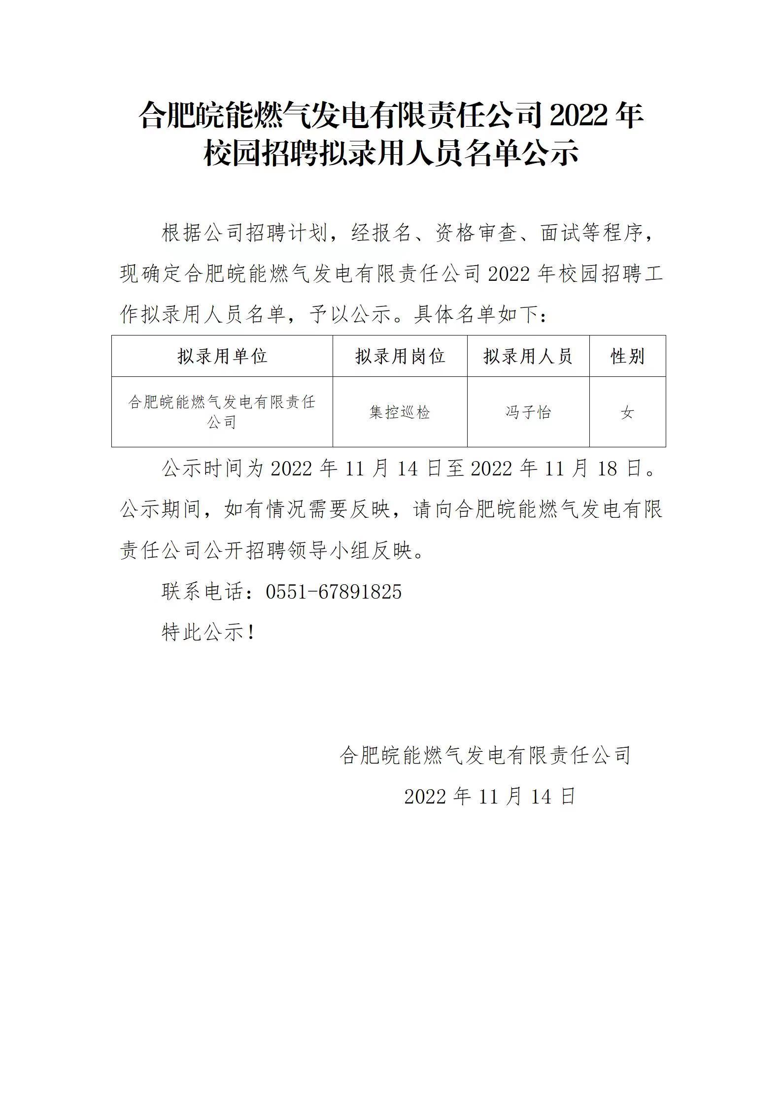 合肥皖能燃氣發(fā)電有限責任公司2022年校園招聘擬錄用人員名單公示