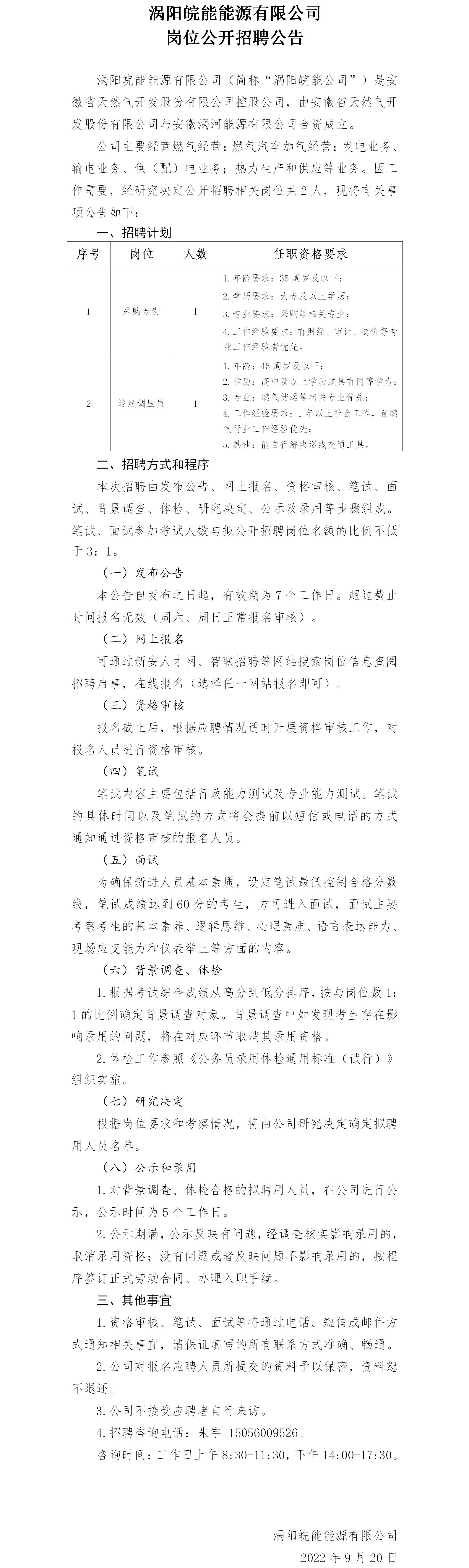 樅陽(yáng)皖能能源有限公司崗位公開招聘公告