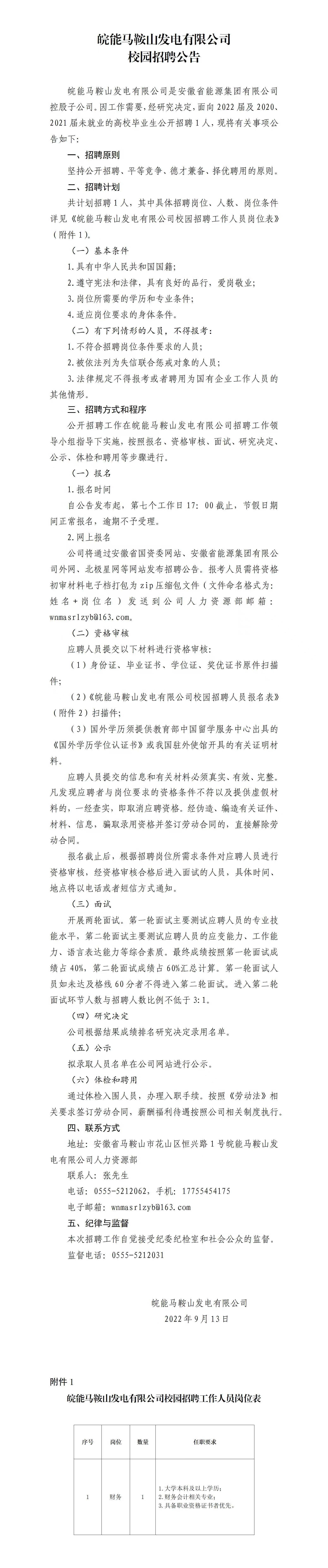 皖能馬鞍山發(fā)電有限公司校園招聘公告